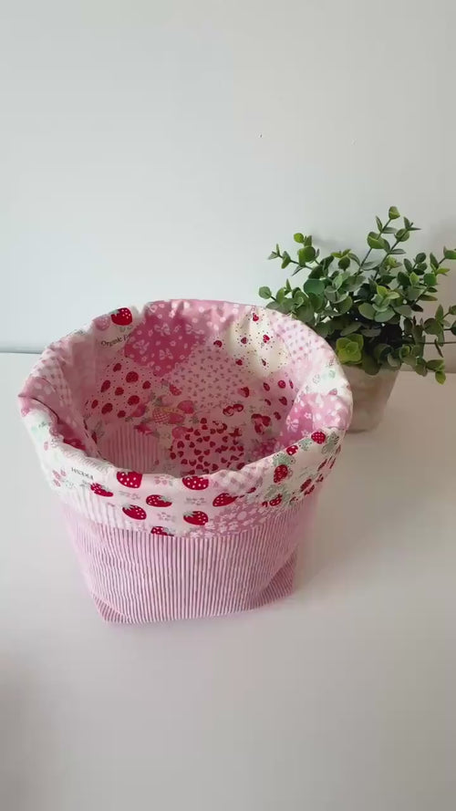 Corduroy Makeup Organizer with strawberry lining – Cotton Vanity puff bucket